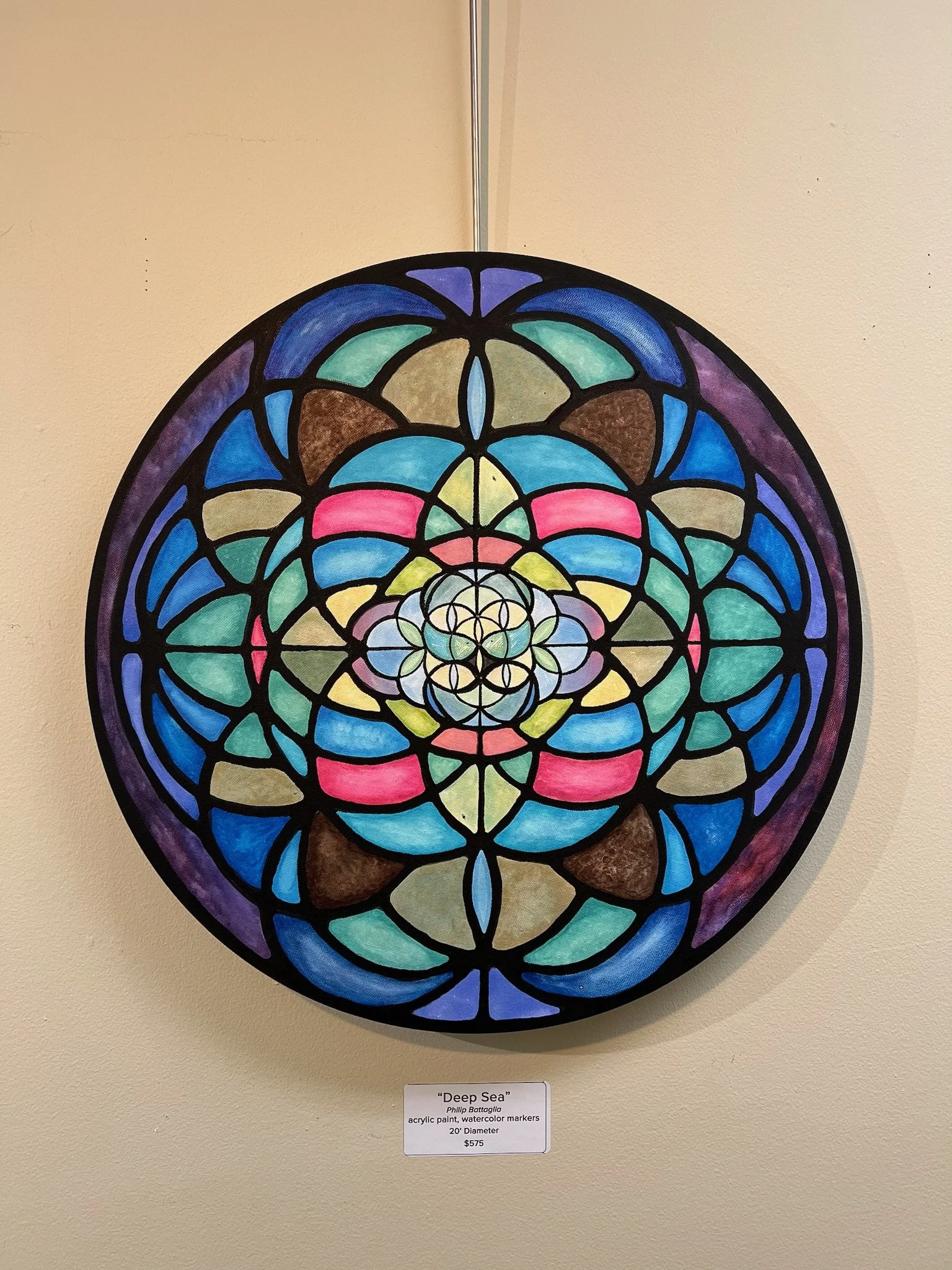 "Deep Sea" acrylic paint and watercolor markers 20" diameter $350 Blush Tea and Coffee