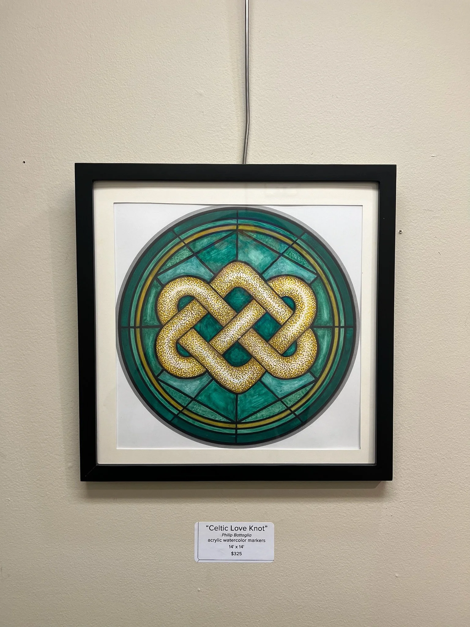 "Celtic Love Knot" acrylic paint and watercolor markers 14" x 14" $175 Blush Tea and Coffee